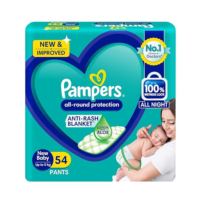 Pampers All Round Protection Pants, New Born/Extra Small (NB/XS) Size, 54 Count, Pant Style Baby Diapers, Anti Rash Blanket, Lotion with Aloe Vera, Up to 5kg Diapers